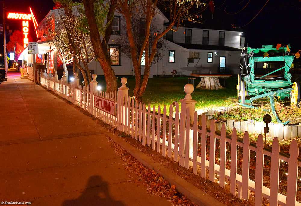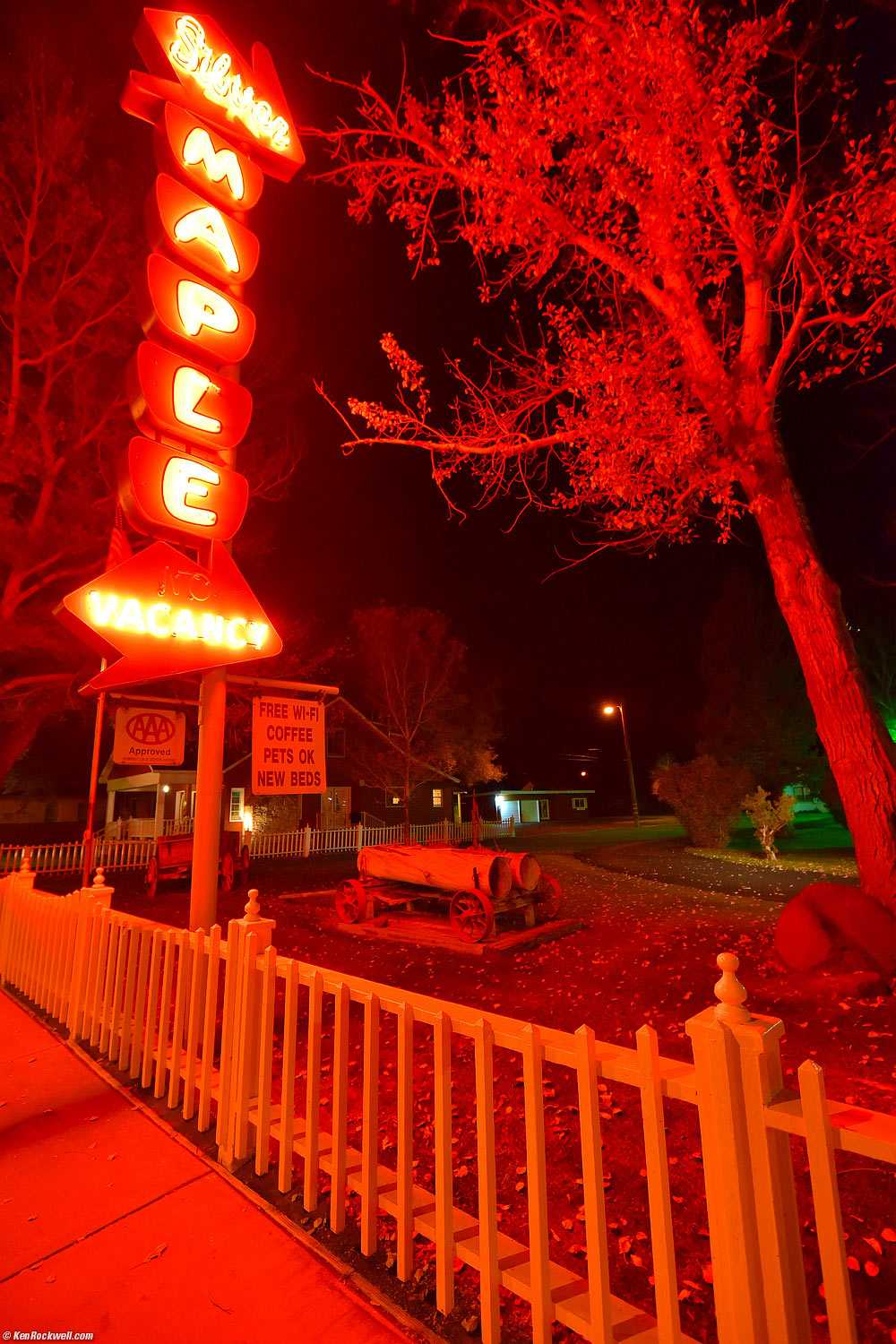 Silver Maple Motel after Dark, Bridgeport, California, 19 October 2014, 7:10 PM. (Nikon D810, Nikon 16-35mm VR at 16mm, f/4 at 1/8 hand held at ISO 1,400, Athentech Perfectly Clear v2.) bigger.