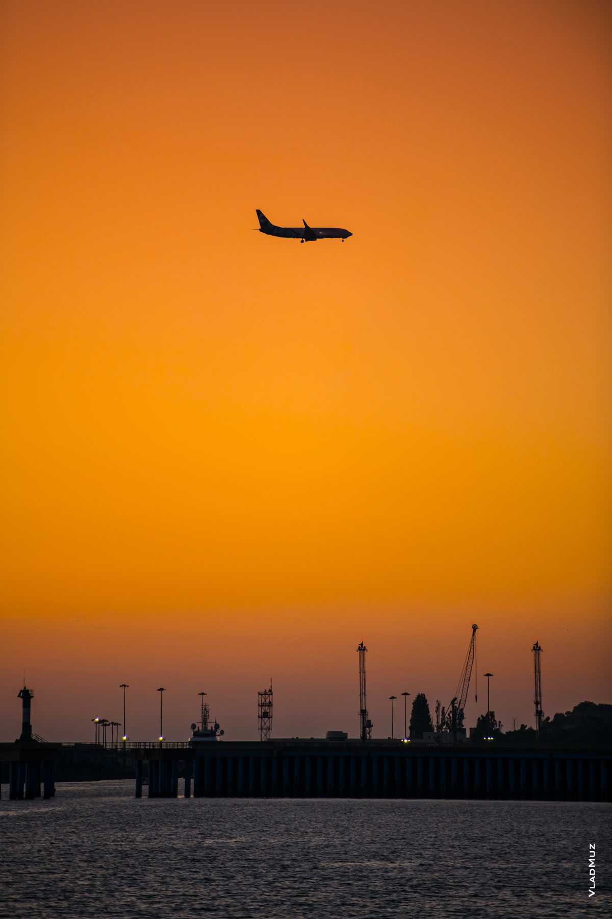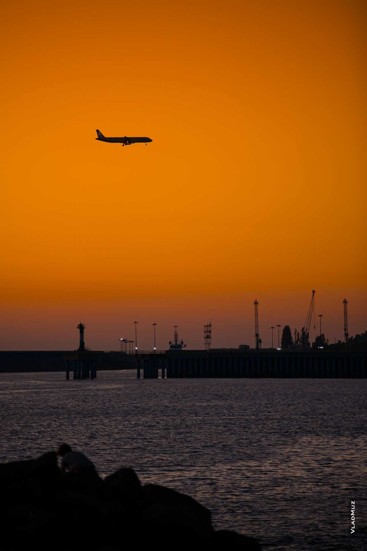 Фото еще одного самолета на фоне заката из галереи Имеретинского морского порта в Адлере