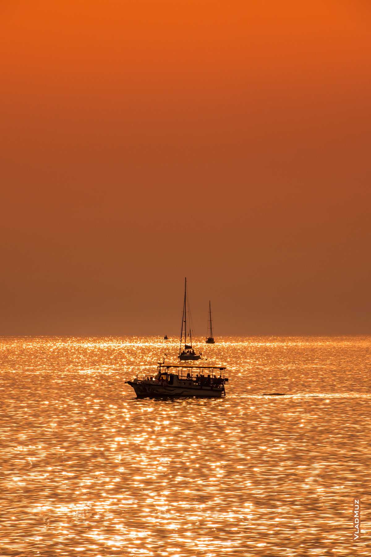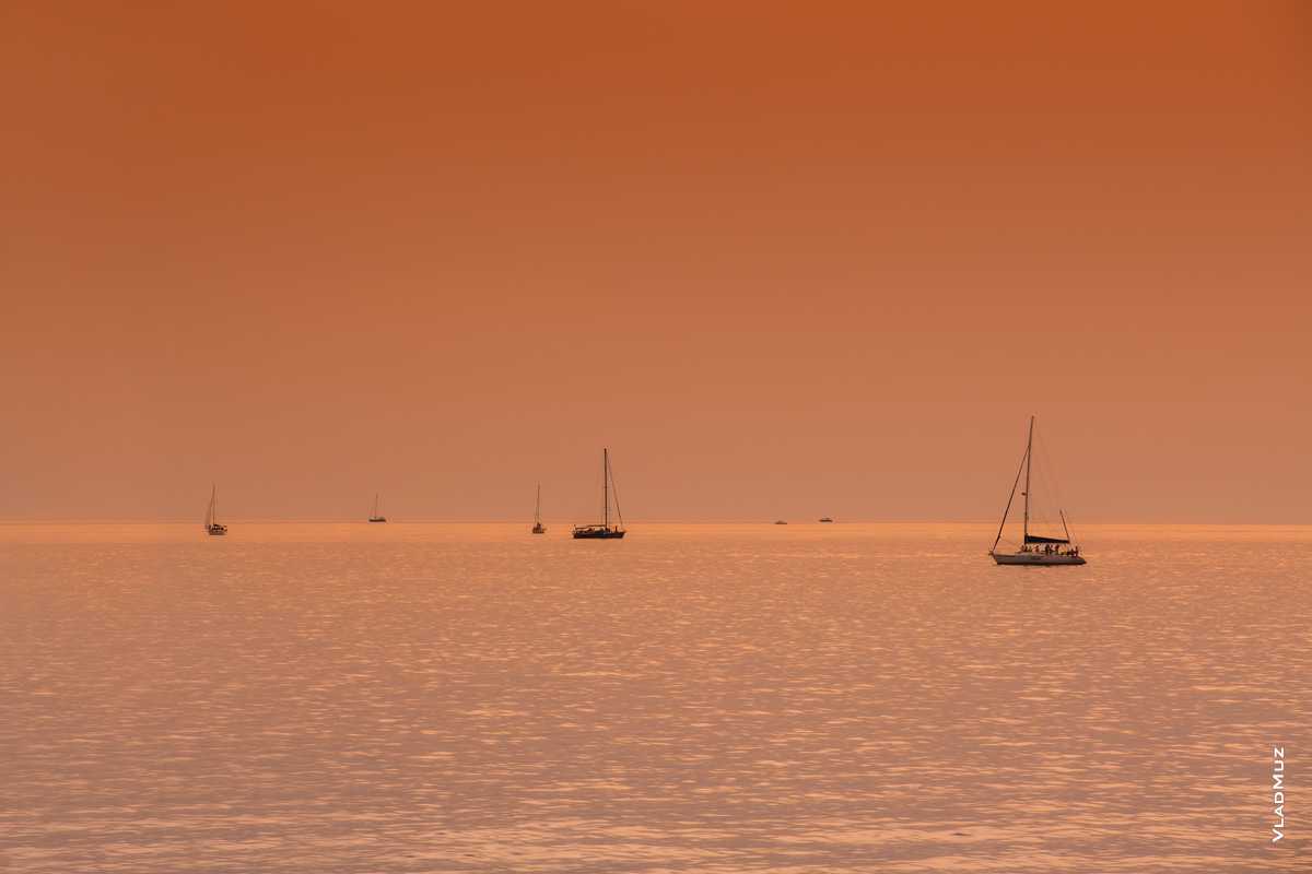 Морской фото пейзаж в теплых тонах: яхты на горизонте в море (фото из галереи Имеретинского морского порта в Адлере)