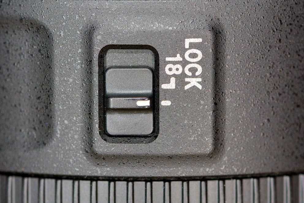 Так же на объективе присутствует блокиратор зума. Кнопка «Lock» фиксирует положение объектива на 18mm фокусного расстояния, предотвращая его выдвижение во время транспортировки. Во многих обзорах Nikon 18-300mm f/3.5-5.6G, указывается, что блокиратор не нужен, так как объектив самопроизвольно не изменяет свое фокусное расстояние в вертикальном положении. Объектив, который я тестировал, был не новый. Его пробег составлял почти 20000 кадров. И, несмотря на это, он не страдал самопроизвольным выдвижением зума под тяжестью собственного веса.