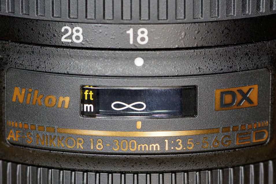 - f/3.5-5.6G – светосила объектива, указывает максимально возможную открытую диафрагму при минимальном и максимальном фокусных расстояниях объектива, от f/3.5 на 18 mm до f/5.6 на 300 mm. G – означает, что у объектива отсутствует кольцо управления диафрагмой, изменять ее значение можно только из камеры, как у всех современных объективов Nikon