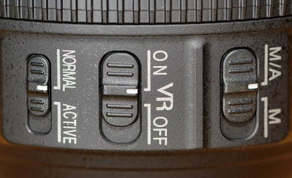Крепление байонета – металлическое с резиновым уплотнителем, препятствующим попаданию влаги и мелких частиц в место соединения объектива с фотоаппаратом. На корпусе есть три переключателя «М/А — М», «VR ON/OFF» и «Normal — Active». Первый отвечает за фокусировку, второй и третий – за работу стабилизатора.