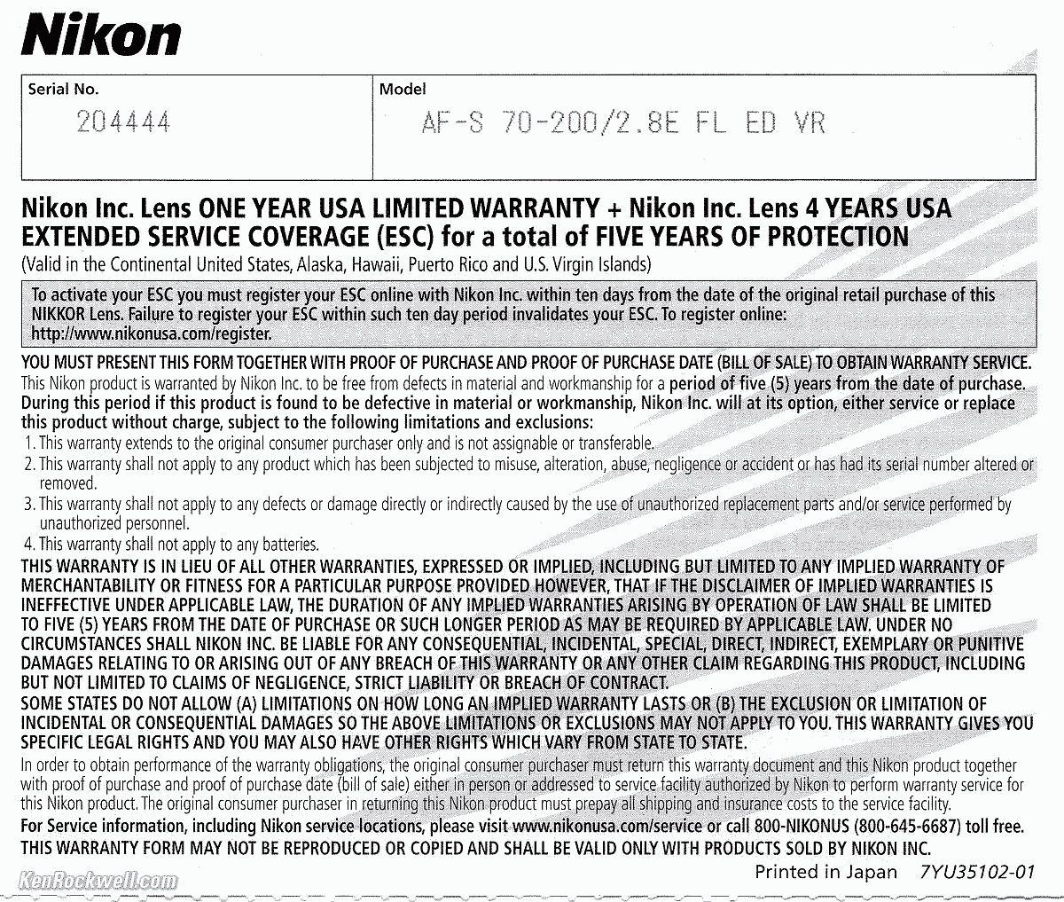 Be sure your card has the same serial number as your lens, otherwise it’s worthless. The serial number on the box should also match the lens and warranty card.