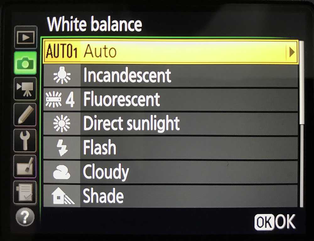 Как уже упоминалось ранее, во многих камерах присутствует несколько пресетов баланса белого, каждый из которых имеет имя и индикатор, соответствующие условиям, для которых он предназначен. Также есть автоматический баланс белого, но он не всегда хорошо справляется со своей работой.