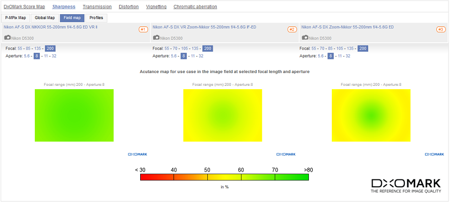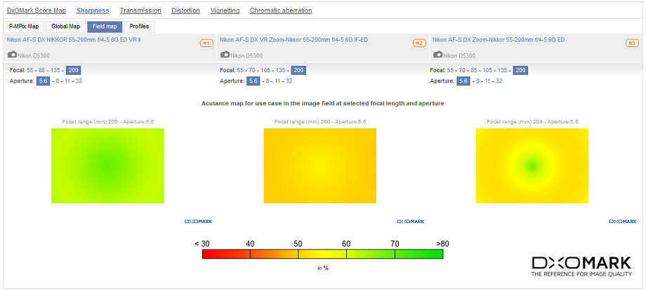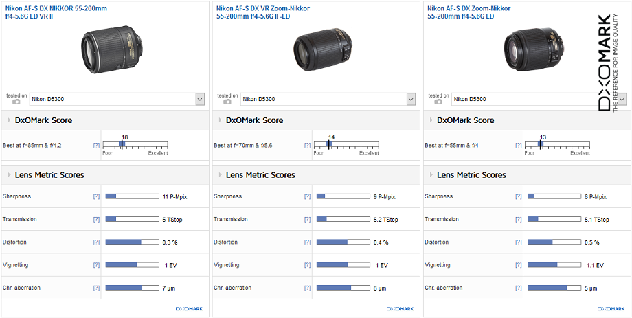 With an overall DxOMark score of 18 points, the latest Nikon 55-200mm f/4-5.6 II lens ranks ahead of the older Nikon competition on our database, thanks to its improved sharpness. Our lab testing identifies very comparable lens metrics for transmission, distortion, vignetting, and chromatic aberration among the three lenses, with minor differences among the scores translating to limited impacts on real-world results.