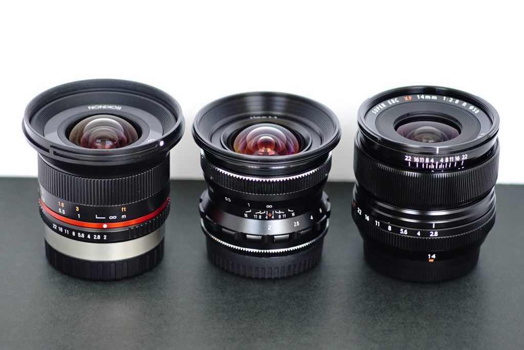 Here is the Pergear 12mm f/2 lens size comparison to two other alternative options for Fuji X mount: Rokinon/Samyang 12mm f/2 (to the left) and Fujinon XF 14mm f/2.8 lens (to the right).