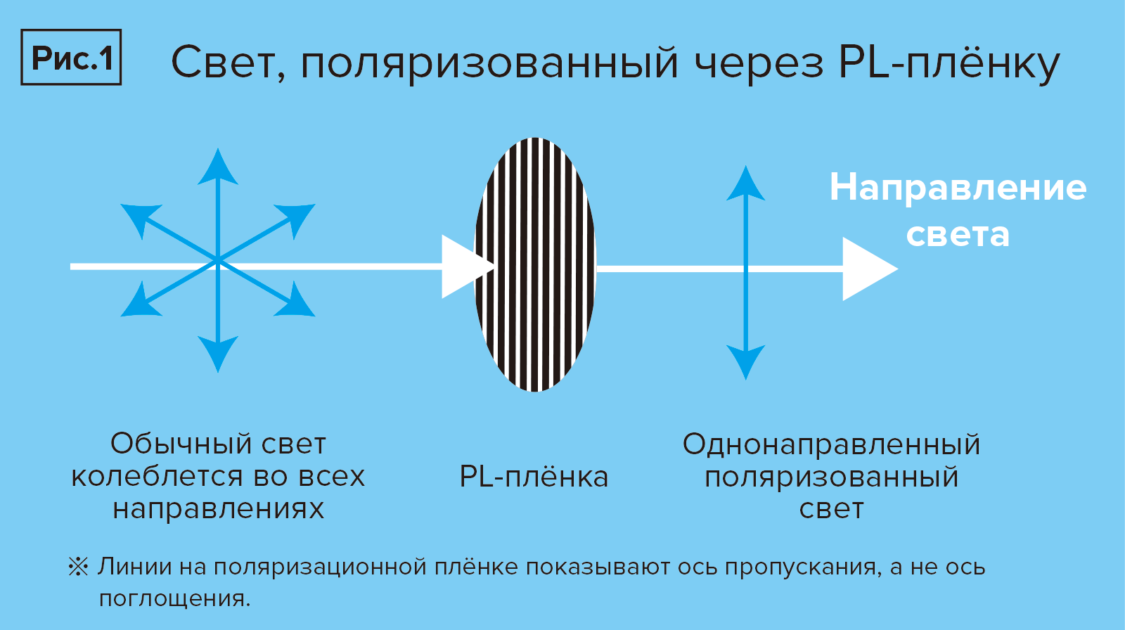 Поляризационный фильтр состоит из двух стёкол с поляризационной плёнкой, зажатой между ними. Структура плёнки представлена в виде решётки из тонких параллельных щелей, невидимых невооружённым глазом, которые пропускают (поглощают) свет в определённом направлении. Обычно свет расходится хаотично, но, пройдя через PL-фильтр, он «поляризуется» в одном направлении (Рис.1).