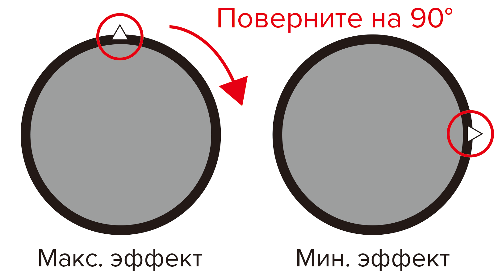 Большинство PL-фильтров имеют на рамке метку в виде треугольника ▲: при перемещении этой метки вверх направление щелей решётки на плёнке стремится к горизонтальному положению. Когда метка доходит до самого верха, поляризационный эффект становится максимальным, однако он может изменяться в зависимости от направления отражённого света. Поэтому на практике фотограф управляет степенью эффекта, вращая оправу и наблюдая за изменениями в видоискатель или на экране камеры.