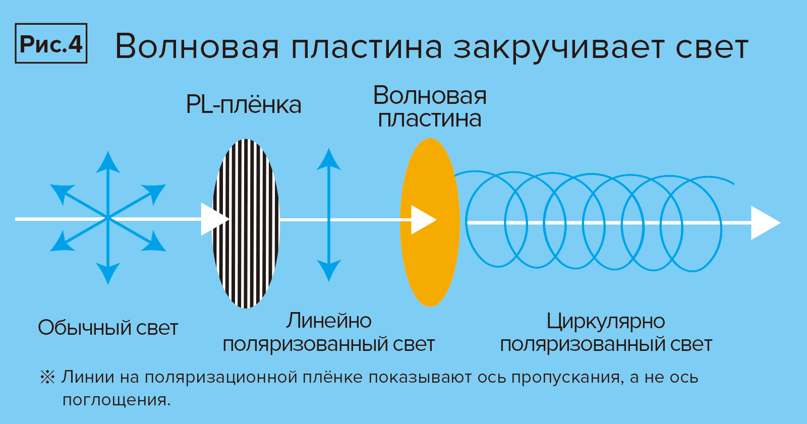 CIR-PL-фильтр имеет дополнительную «фазово-контрастную пластину» (Рис.3). Когда через неё проходит свет, он превращается во вращающийся по кругу свет, который аналогичен обычному хаотичному свету, расходящемуся во всех направлениях (Рис.4). Таким образом, он позволяет избежать помех в работе камеры. Поэтому большинство поляризационных фильтров, представленных в настоящее время на рынке, являются циркулярными.