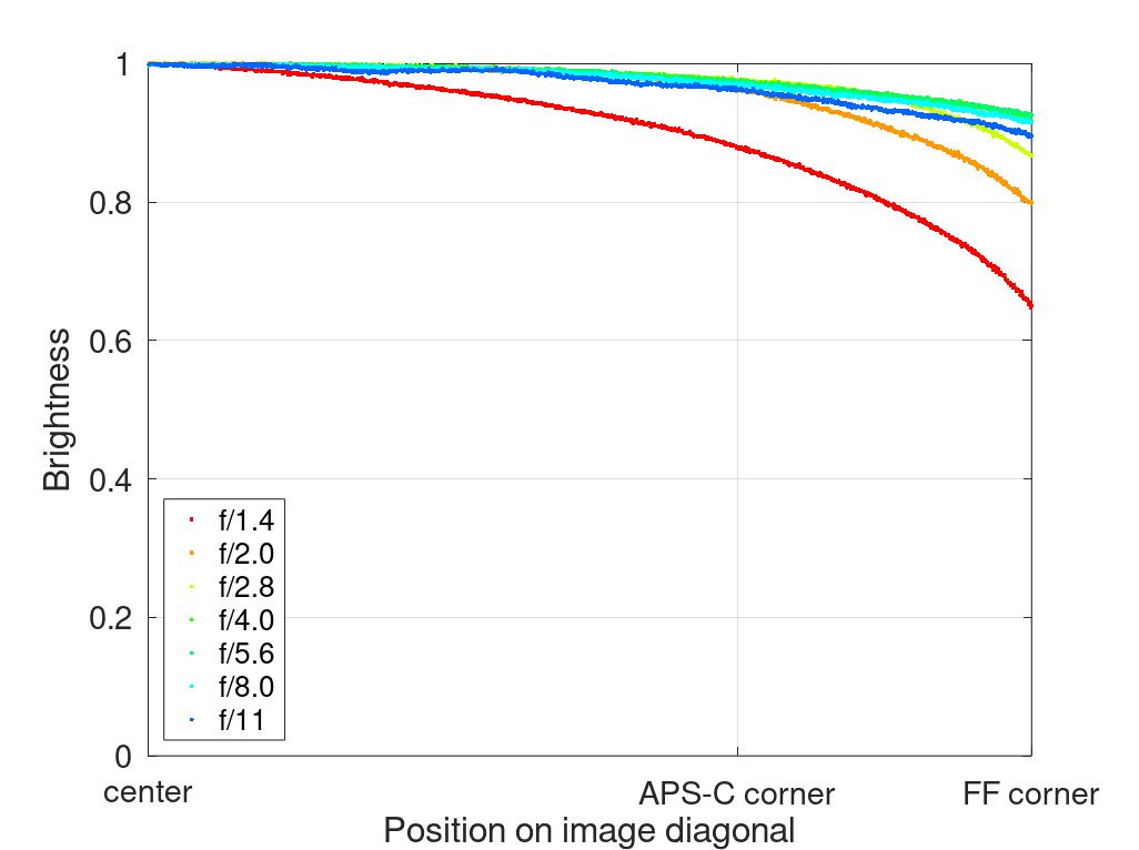 Wide open the light falloff amounts to roughly 1.9 EV, stopped down to f/2.0 this improves to 1.0 EV, stopped down to f/2.8 it is 0.7 EV and stopped down to f/8.0 almost unnoticeable 0.4 EV.
