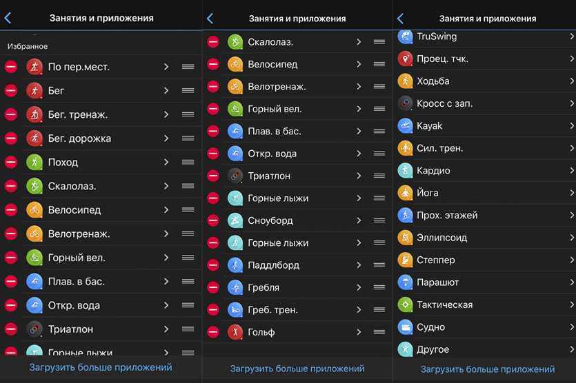Производитель разделил спортивные профили. Теперь разные виды спорта на часах функционируют отдельно – плавание, лыжи, бег, велоспорт, гольф, тренировка и пр. Каждый из указанных профилей имеет внутри функции отслеживания активности, результатов, программирования занятий и т.д.
