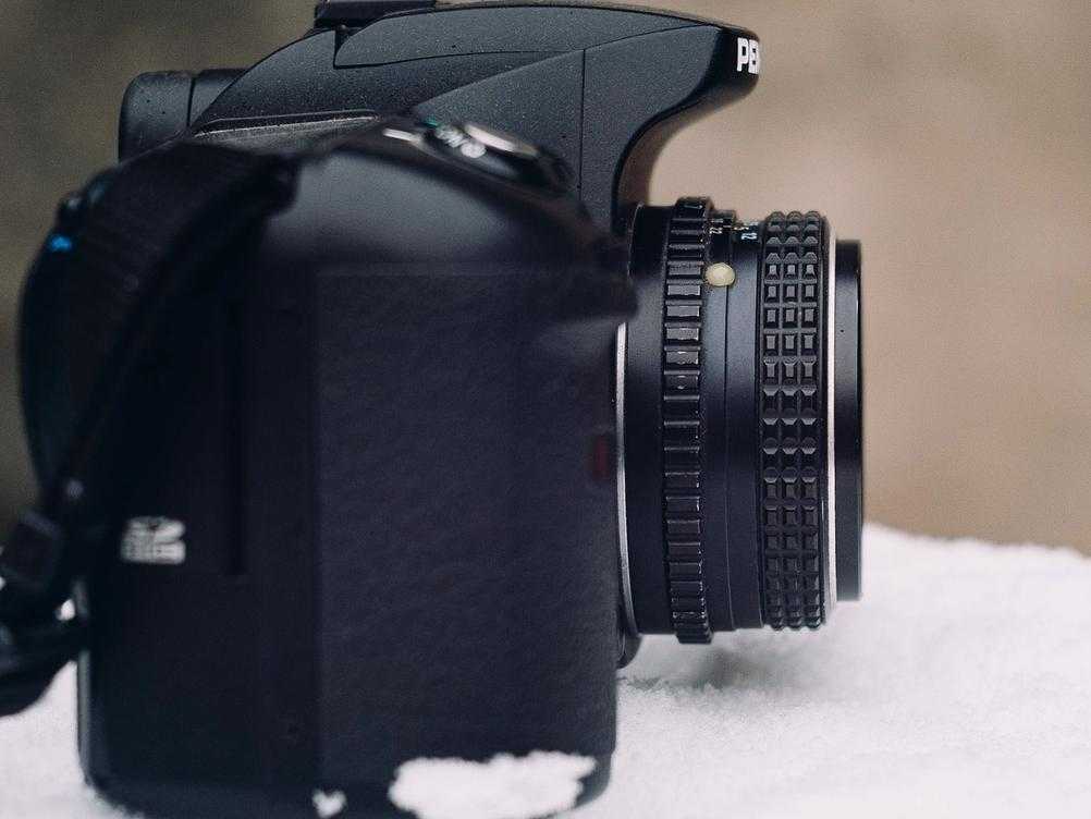 On Pentax K10D the lens acts almost as a pancake lens. The protruding camera part housing the «Pentax» logo reaches almost as far as the lens itself.