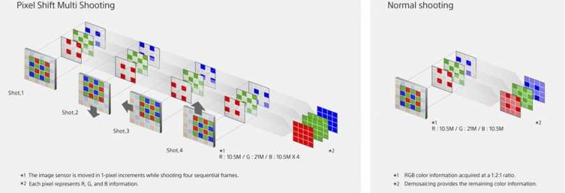 Эта система задействована в новом режиме высокого разрешения Pixel Shift Multi Shooting, при котором создаётся четыре изображения перемещением сенсора после каждого снимка. При этом каждый пиксель в конечном изображении получает данные с красного, синего и двух зеленых фильтров. Это позволяет устранить недостатки массива фильтров Байера. Для каждого пикселя захватывается полная информация о цвете, что снижает уровень шума, позволяя усреднить его количество на основе данных со снимков. Камера делает 16 изображений, последовательно сдвигая датчик. Полученный массив разрешением 960 МП может быть обработан с помощью программного обеспечения Sony Imaging Edge для создания фотографий разрешением 240 МП. Пользователь может выбрать режим со сдвигом на целый пиксель или на половину пикселя. Камере также нужно время для сохранения данных между снимками, ожидание может составлять до 2 секунд.