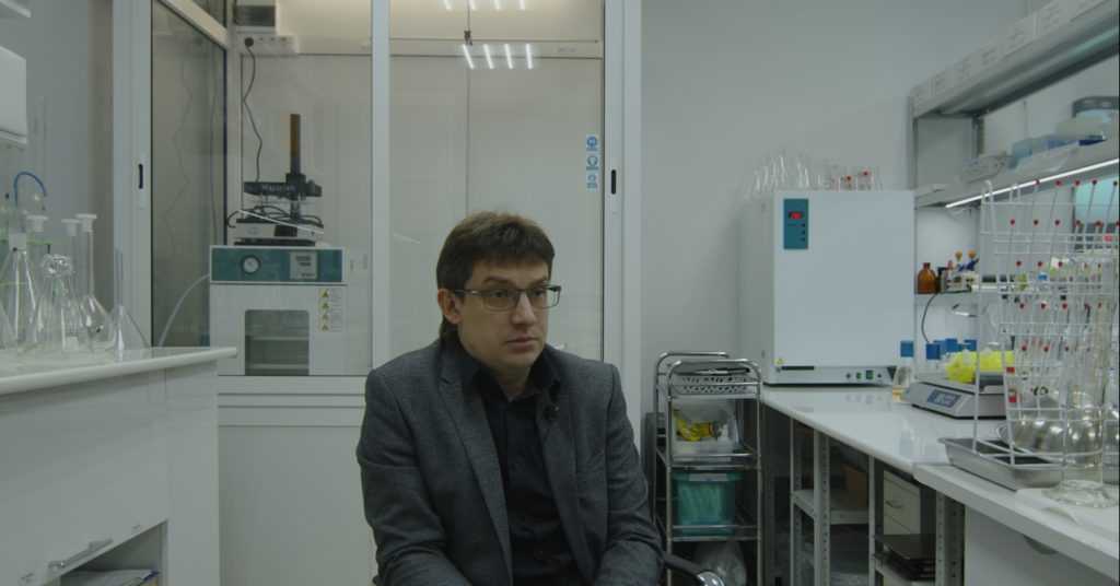 По этой же причине этот объектив был выбран в качестве основного при съемках Алексея Аксенова-Грибанова, который также изучает возможности иммунитета байкальских организмов. В его лаборатории достаточно много фактурных анализаторов и всевозможных колб, которые добавляют своеобразный антураж. При этом само расположения шкафов и стеллажей — симметрично.