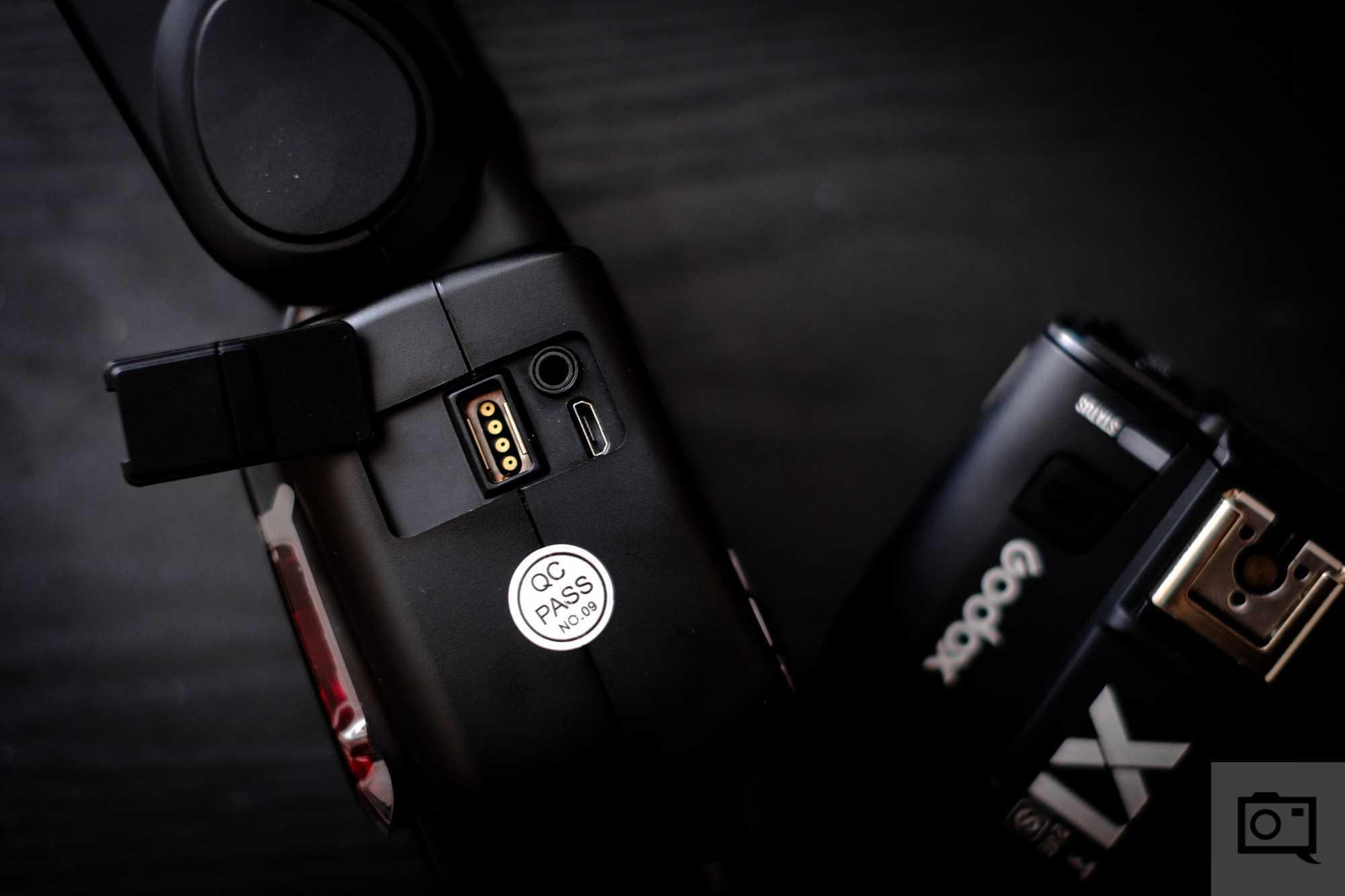 Сбоку порты подключения закрытые резиновой крышкой. Если у вас есть другие вспышки GODOX, то вы можете подключать приёмники. Тем не менее, вспышка имеет радиосинхронизатор, так что дополнительно внешние приёмники использовать не обязательно.