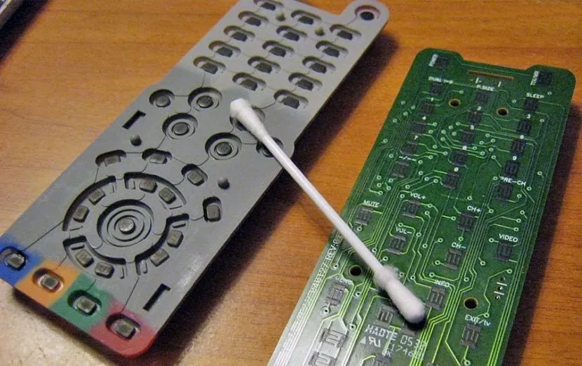 Еще одна причина плохого контакта — попадание пыли, жира и других загрязнений во внутреннюю часть ПДУ. Устранить дефект можно самостоятельно. Для этого необходимо аккуратно разобрать устройство, отделить мембрану от контактных площадок и тщательно протереть все внутренние элементы спиртом. Как показывает практика — проще купить новый пульт, чем заниматься его чисткой.