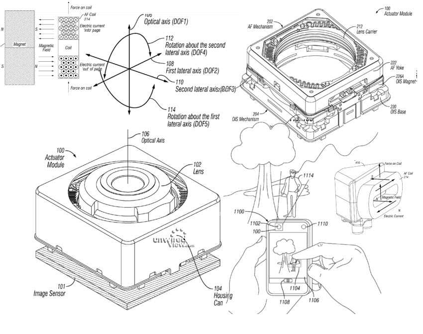 Изображения из патентной заявки от Apple, в которой описывается метод для интеграции оптической стабилизации в миниатюрных камерах.