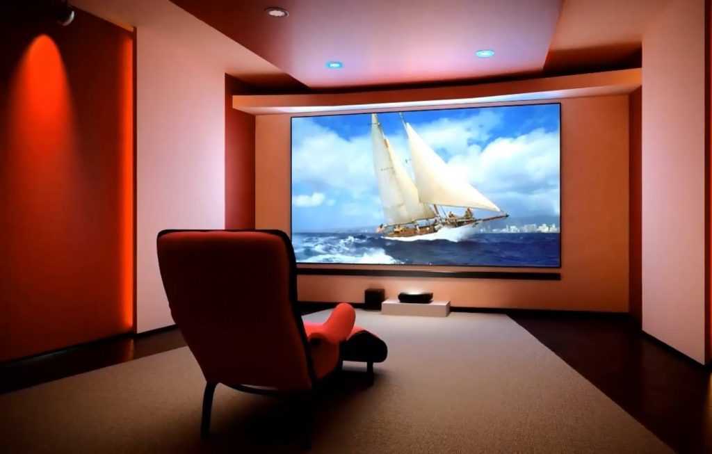Материал интерьера для домашнего кинотеатра выбирают темных тонов, чтобы он не отражал свет Важно! Часто встречаются модели проекторов со ртутными лампами, но производители постепенно от них отказываются. Требования к лампе для домашнего кинотеатра: она должна быть с длительным сроком эксплуатации и яркостью не менее 900 лм (чем больше, тем лучше)