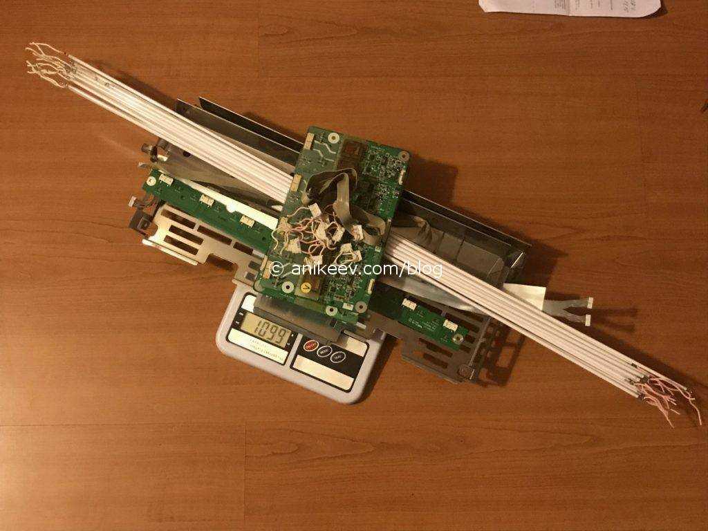 А теперь к преимуществам: телевизор похудел на 1100 грамм. Вот все лишние детали на весах.