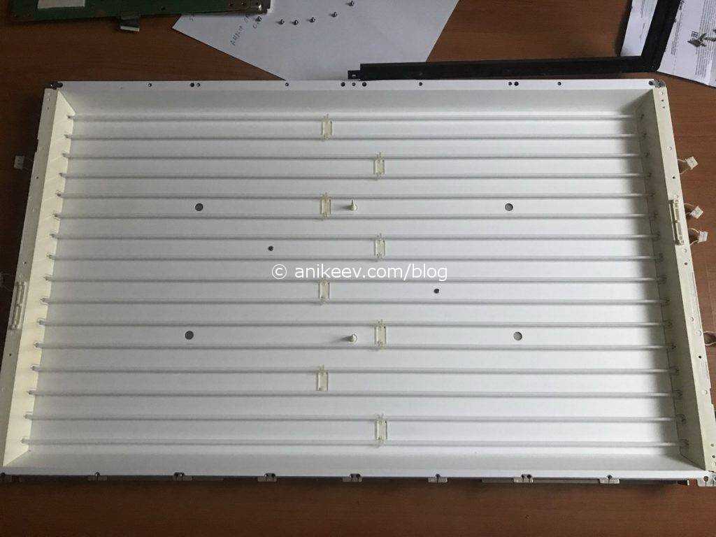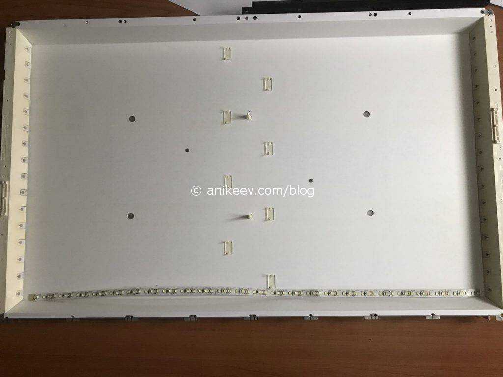- При ремонте подсветки придется разбирать весь телевизор, в т.ч. поднимать стекло и остальные слои матрицы, это чревато её повреждение или, как минимум, попаданием пыли и ворса под стекло. Все это будет видно на белом фоне после сборки.