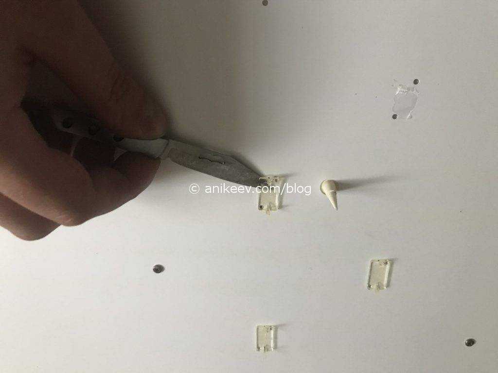Получилось 625мм ленты, то есть пяти метров хватит ровно на 8 отрезков. Поэтому отрезки будут находиться там, где сейчас стоят пластиковые держатели CCFL-ламп. Берём нож и снимаем держатели. Пластиковые шипы тоже выкусываем.