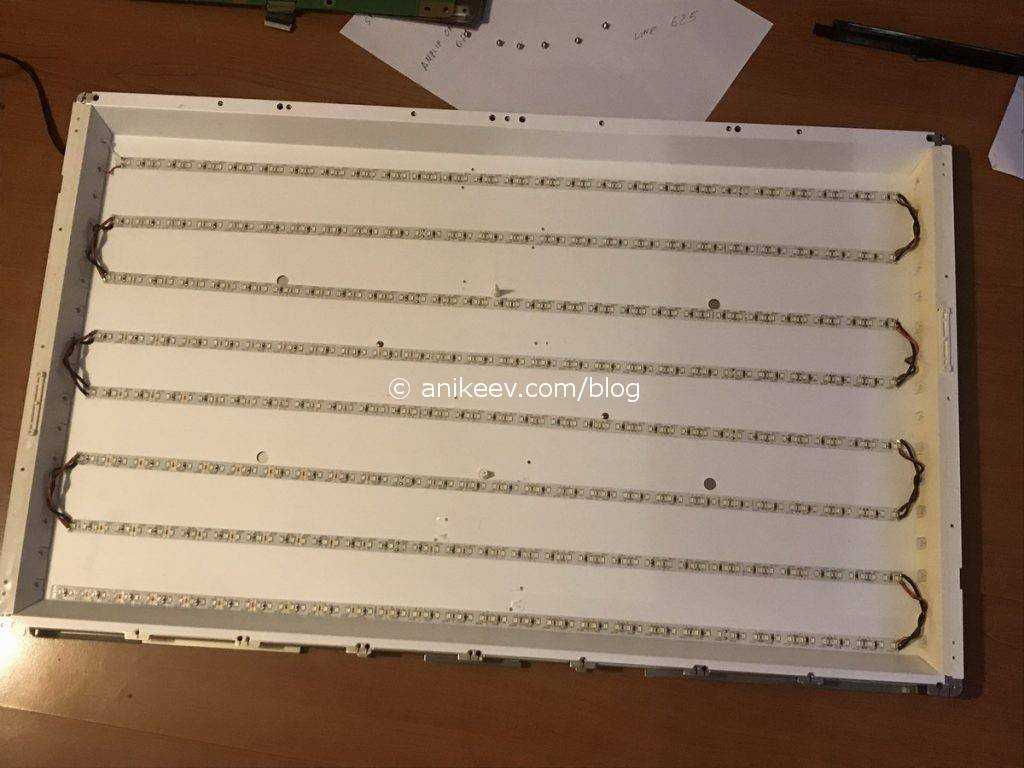 Теперь о недочётах. Яркость подсветки не регулируется. Но восемь отрезков дают средний уровень яркости. Я планирую добавить ещё 5 метров подсветки, чтобы сделать её более равномерной, но… Честно скажу, повторять полную многочасовую разборку телевизора очень лениво. Возможно, когда-нибудь…