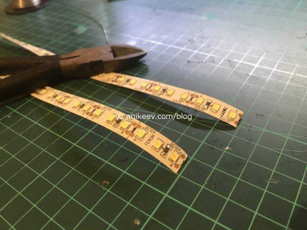 А теперь перемещаемся в лабораторию. Нарезаем ленту на 8 отрезков по 625мм каждый, укладываем змейкой и последовательно паяем. Не забывайте соблюдать полярность!