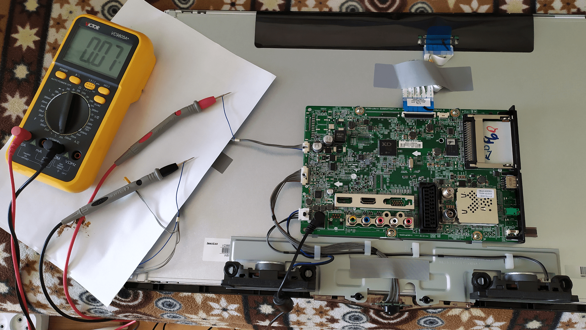Для ЖК-телевизора LG 24LF450U замерить общий ток через светодиоды можно включив мультиметр в разрыв синего провода у шлейфа, соединяющего основную плату и плашку LED-подсветки.