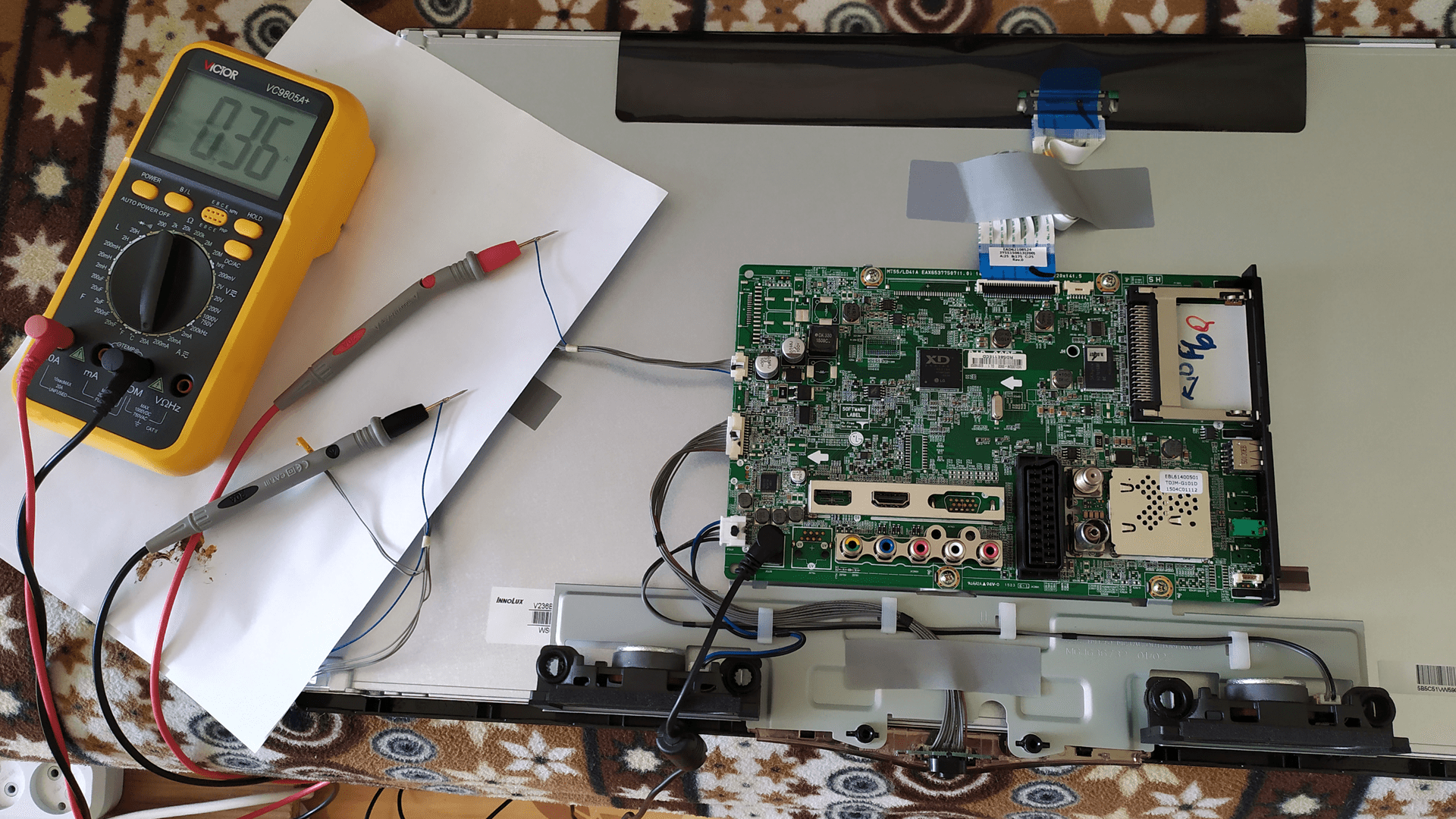 Замер тока LED-подсветки сразу после включения телевизора (без подключенного сигнала). На дисплее мультиметра 360 мА.