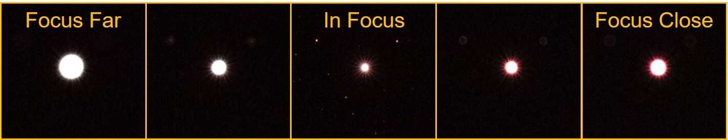 4) As you adjust the focus ring, the aim is to make the star as small as possible. You will need to move in and out of focus a few times to help you decide when the star is as small as you can make it; see the image sequence below for an illustration.
