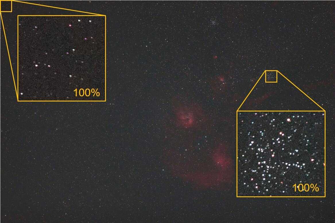In reality, the effect is only visible around bright stars and is relatively small in its extent. The two stars shown above are the bright stars from my Horsehead nebula image shown earlier in the post, and in my opinion, this effect does not spoil the overall image.