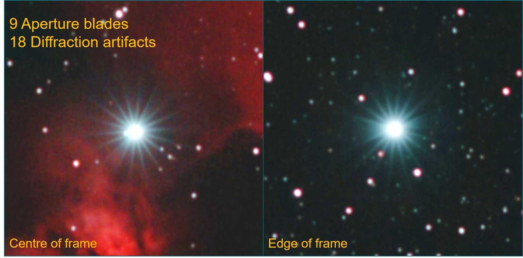 Below is an example of this effect on bright stars. These two stars in the image are viewed at 100% zoom, and to highlight the effect, I have applied an aggressive curves stretch in photoshop.