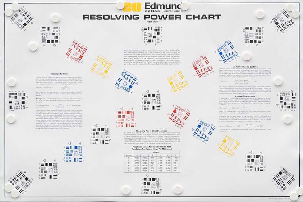 The chart used here was the Edmund Optics Resolving Power Chart shot at a distance of 10 meters on a sturdy tripod and manually focused on the center.