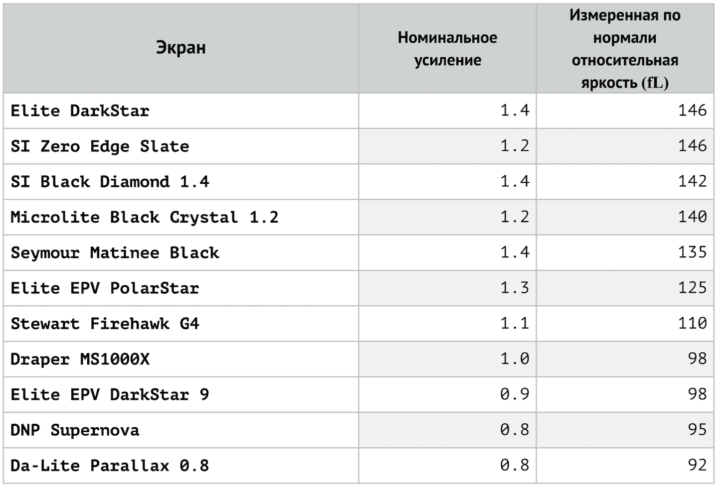 В этом тесте мы измеряли яркости по нормали в центре экранов при подаче на проектор тестового пикового белого (уровень сигнала 100 IRE). Цель — сравнение относительных яркостей (по нормали, в центре). Вот результаты по убыванию яркости:
