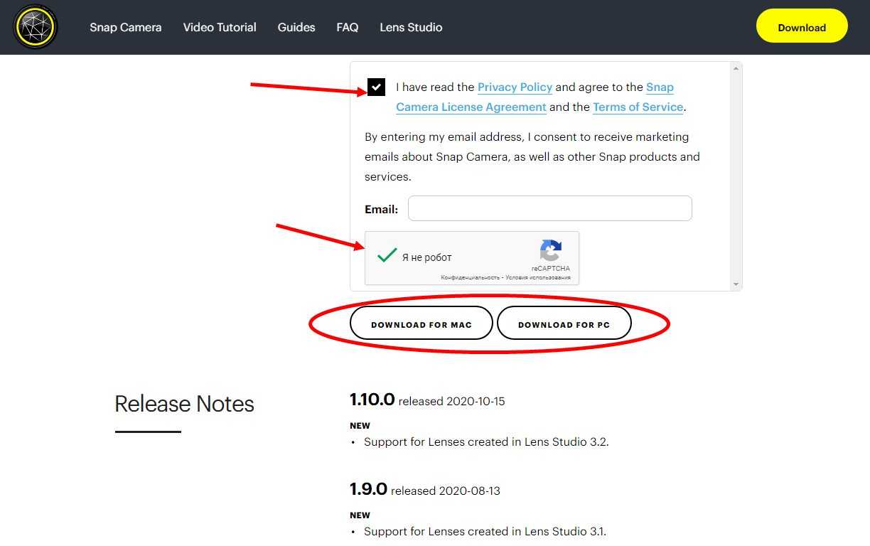 - Открываем браузер на ПК и переходим на официальную страницу сервиса (https://snapcamera.snapchat.com/download/).