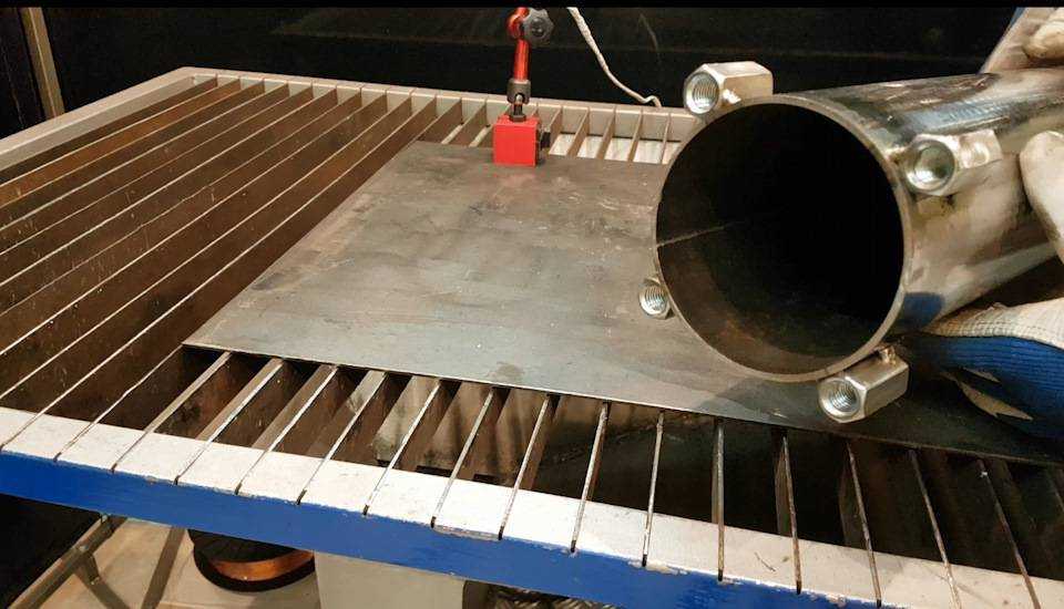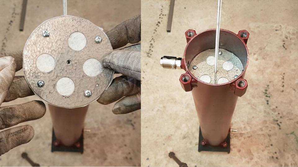 - Для устойчивого положения конструкция с противоположного (нижнего) края оборудуется основанием: кусок железа размером 35-35 см или других параметров приваривается ко дну фильтра.