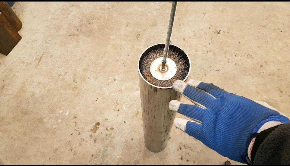 От трубы отрезал 80 см., от швеллера 2 квадрата 14х14 см. Все очистил от ржавчины.Для очистки трубы изнутри использовал круг проволочный 100 мм., с приваренной к нему шпилькой, зачистил не до блеска, но ржавчины и прочей дряни не осталось.