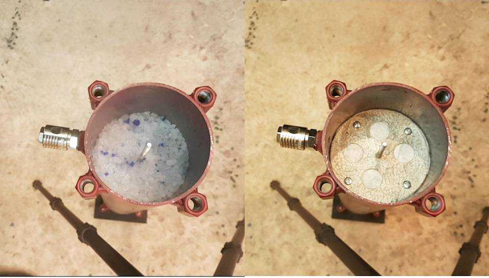 В результате получается устройство, содержащее в верхней части засыпную горловину и редуктор. Внизу – соединительный патрубок для забора воздуха. Вся конструкция опирается на устойчивое основание. Она обязательно проверяется на герметичность путем подключения компрессора. При нормальном исходе в горловину насыпается силикагель до отметки нижнего края верхней сетки. Подключаются шланги, и осушитель готов к работе.