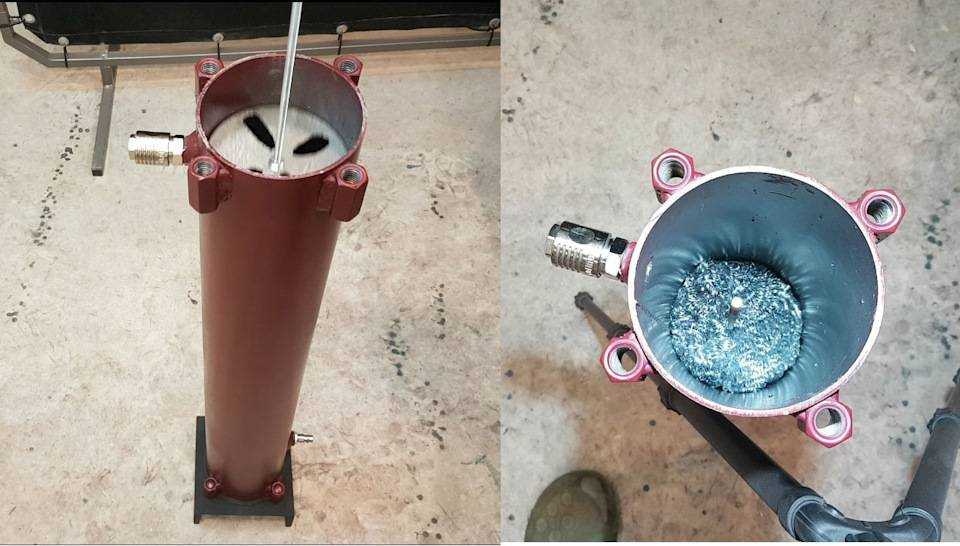 - В качестве фильтрующего элемента внутрь насыпается отходы токарного производства (стружка).