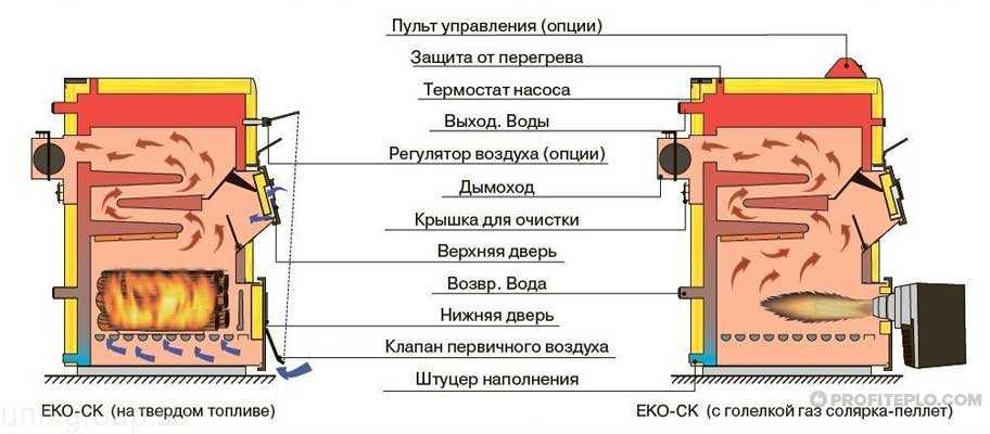 Исключение – дешевые твердотопливные котлы прямого горения, не оборудованные автоматикой. При перегреве теплоноситель в них закипает, поскольку горящие дрова нельзя потушить в один момент. Если циркуляционный насос установлен на подаче, то образующийся пар вперемешку с водой поступает внутрь корпуса с крыльчаткой. Дальнейший процесс выглядит так: