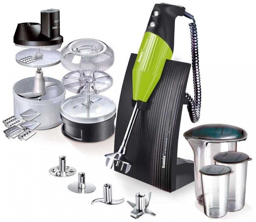 Комплект насадок входит в состав комплектации. Для каждого вида операции – измельчение, перемешивание, взбивание и пр. используется своя насадка. Наличие в комплектации насадки-венчика позволяет использовать устройство в качестве миксера.