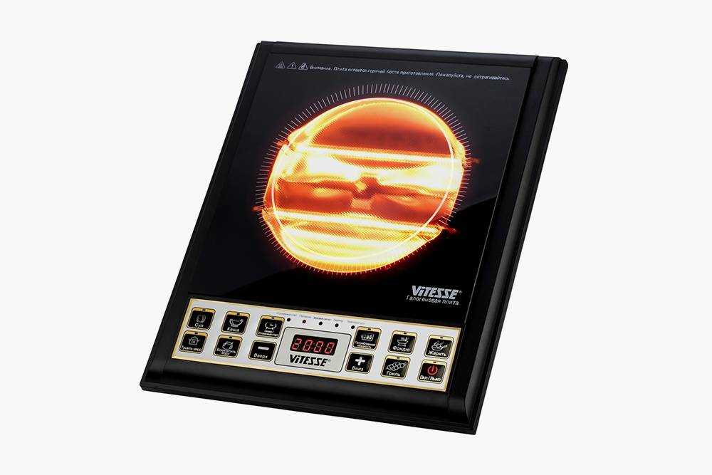 - галогенных панелей на нагрев резистивного элемента с последующей последовательной передачей тепловой энергии к защитной поверхности и окружающей среде, а затем на посуду;