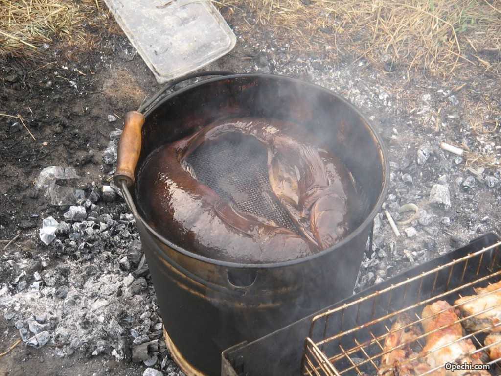 Коптильня горячего копчения – самый простой вид агрегатов для копчения рыбы и мяса. Из бочки следует удалить дно и верхнюю часть, установить на двух уровнях решетку и внизу поддон для жира. Бочку необходимо ставят непосредственно на огонь можно коптить горячим способом.