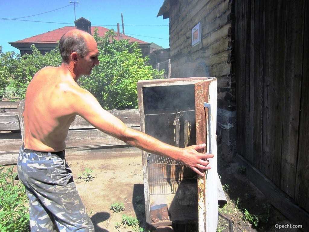 У кого на участке есть старый холодильник. Может сделать из него коптилку для горячего копчения. Для этого убираются все внутренности и приваривается три пары уголков – две сверху и одну снизу. Две верхние нужны для укладки на них решеток, а нижняя – для глубоко поддона, в который будет собираться жир в процессе работы. В верхней части холодильника необходимо проделать небольшое отверстие для выхода дыма. Внизу холодильника нужно установить электрическую плиту, а сверху нее поддон с опилками. Включив плиту, опилки начнут тлеть и выделять много дыма, который превратить сырой продукт в копченый. Для того. Чтобы закоптить мясо в таком устройстве, достаточно 2 часов.