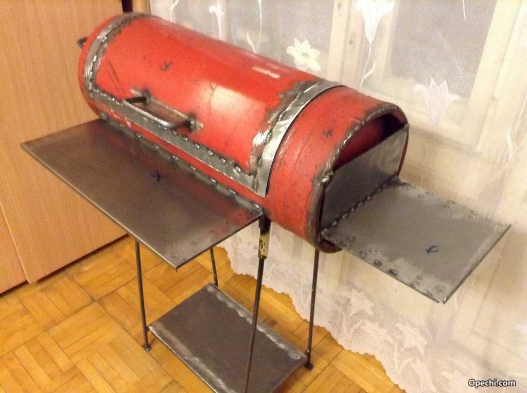 исполняются вне дома (на любом пустыре). Убедившись в полном отсутствии газа внутри баллона, его можно привести домой и продолжить устройство агрегата. Первым делом вырезается дверь и к ней привариваются петли. Затем следует убрать половину днища и соединить его трубой с топкой. К верней части (где располагался вентиль) приваривается труба для выхода дыма. Внутри баллона ставится решетка для укладки на нее сырых продуктов.