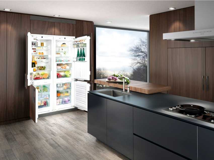 Наибольшее количество встроенных моделей sidebyside выпускает немецкая компания Liebherr. Агрегаты могут иметь как две, так и три камеры. Дополнительно к морозилке и холодильному шкафу добавляется отделение для хранения вина. Общий объем такого холодильника достигает 899 л, а ширина составляет 167,7 см.