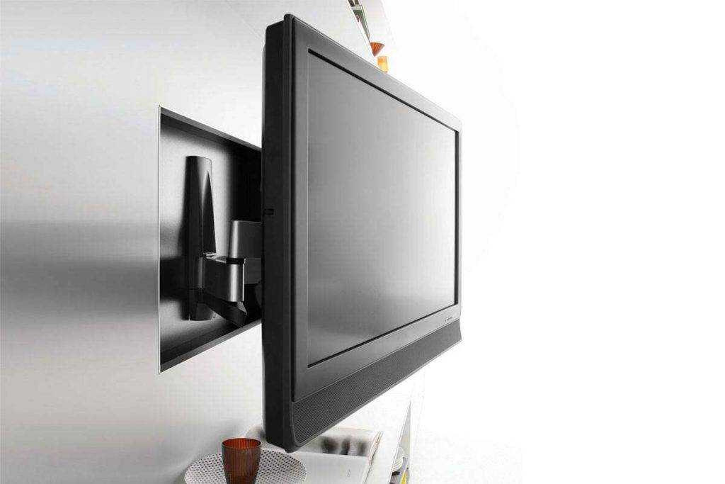 Если место для ТВ осталось только над СВЧ, то лучше не поставить панель поверх печи, а повесить на стену на кронштейнах. Такой вариант размещения микроволновки и телевизора на кухне считается вполне безопасным, поскольку приборы не соприкасаются напрямую.