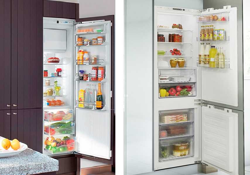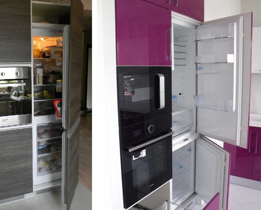 В зависимости от типа техники, холодильник может быть полностью либо частично встраиваемым. В обоих вариантах прибор помещается в отдельный пенал, являющийся продолжением кухонного гарнитура. Полная встраиваемость подразумевает открывание дверцы холодильника одновременно с открыванием пенала, а вот при частичной встраиваемости дверцы могут быть независимы друг от друга или же дверца пенала отсутствует.