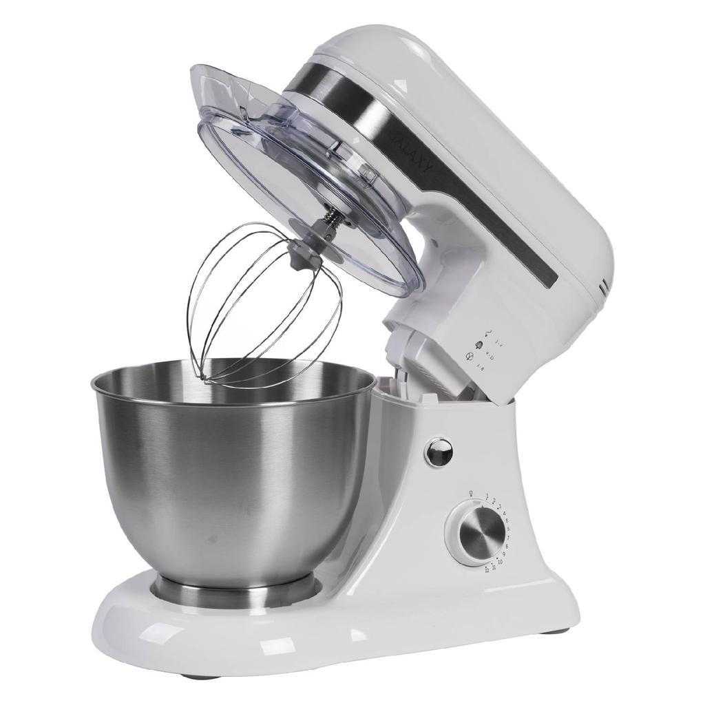 Стационарный миксер из пластика и металла, оснащенный чашей из нержавеющей стали, которая имеет защитную крышку. Мощность устройства составляет 600 Вт. Прибор имеет в комплекте 3 основные насадки: для взбивания, для теста и для смешивания.