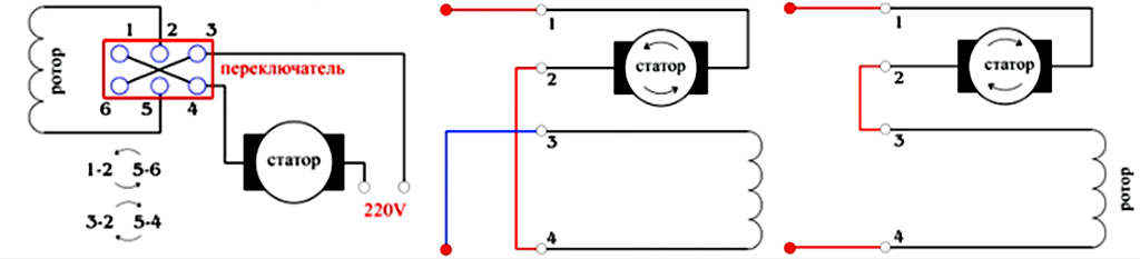 Чтобы изменилось вращение ротора, достаточно поменять полярность напряжения на обмотке ротора или статора, как и в двигателях постоянного тока, от которых универсальные машины практически не отличаются.